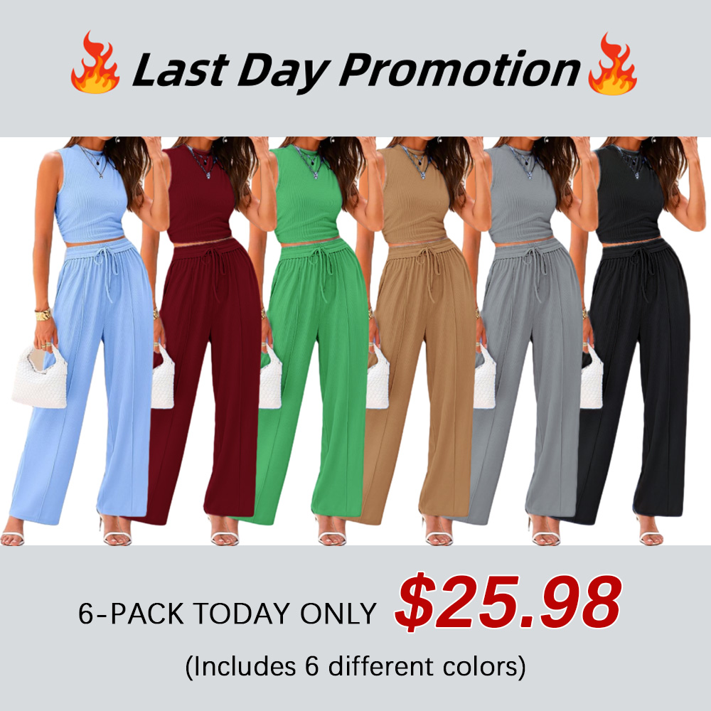 Women Summer 2 Piece Outfits Ribbed Knit Cropped Top Elastic Waist Wide Leg Pants Lounge Set