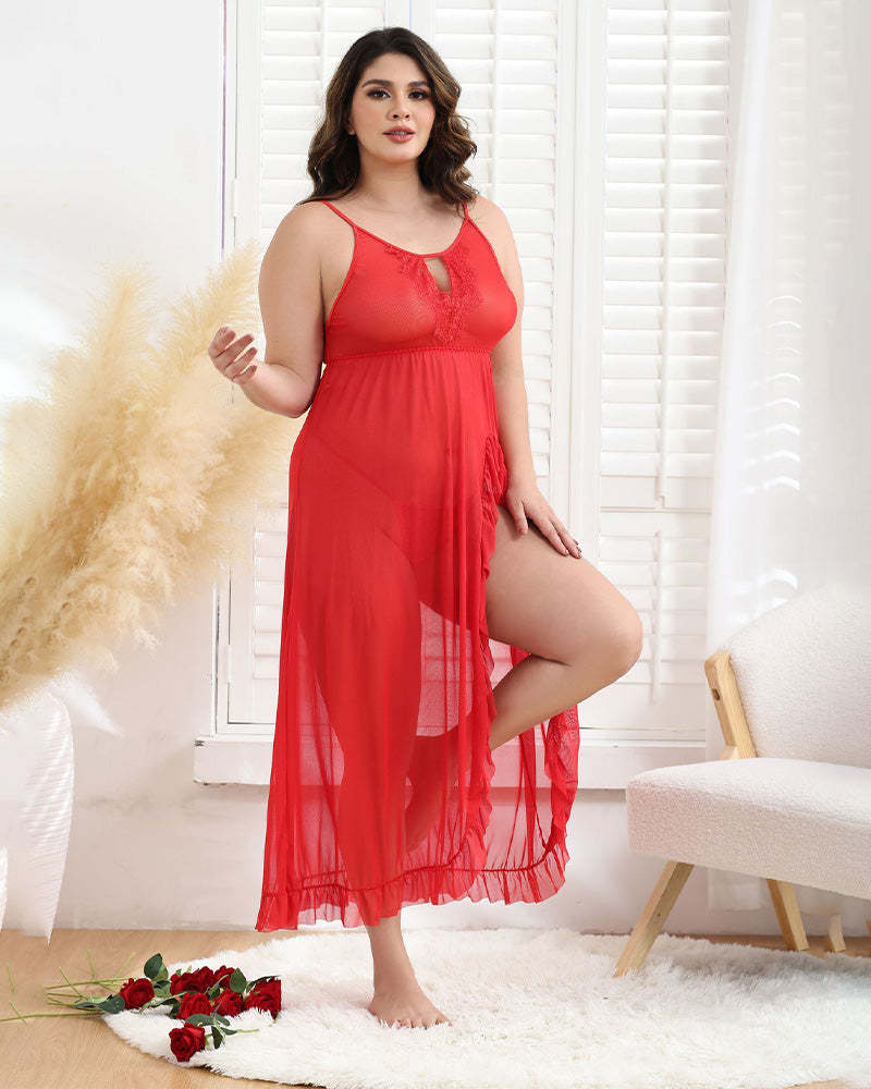 Plus Size Lace Mesh Side Slit Nightgown