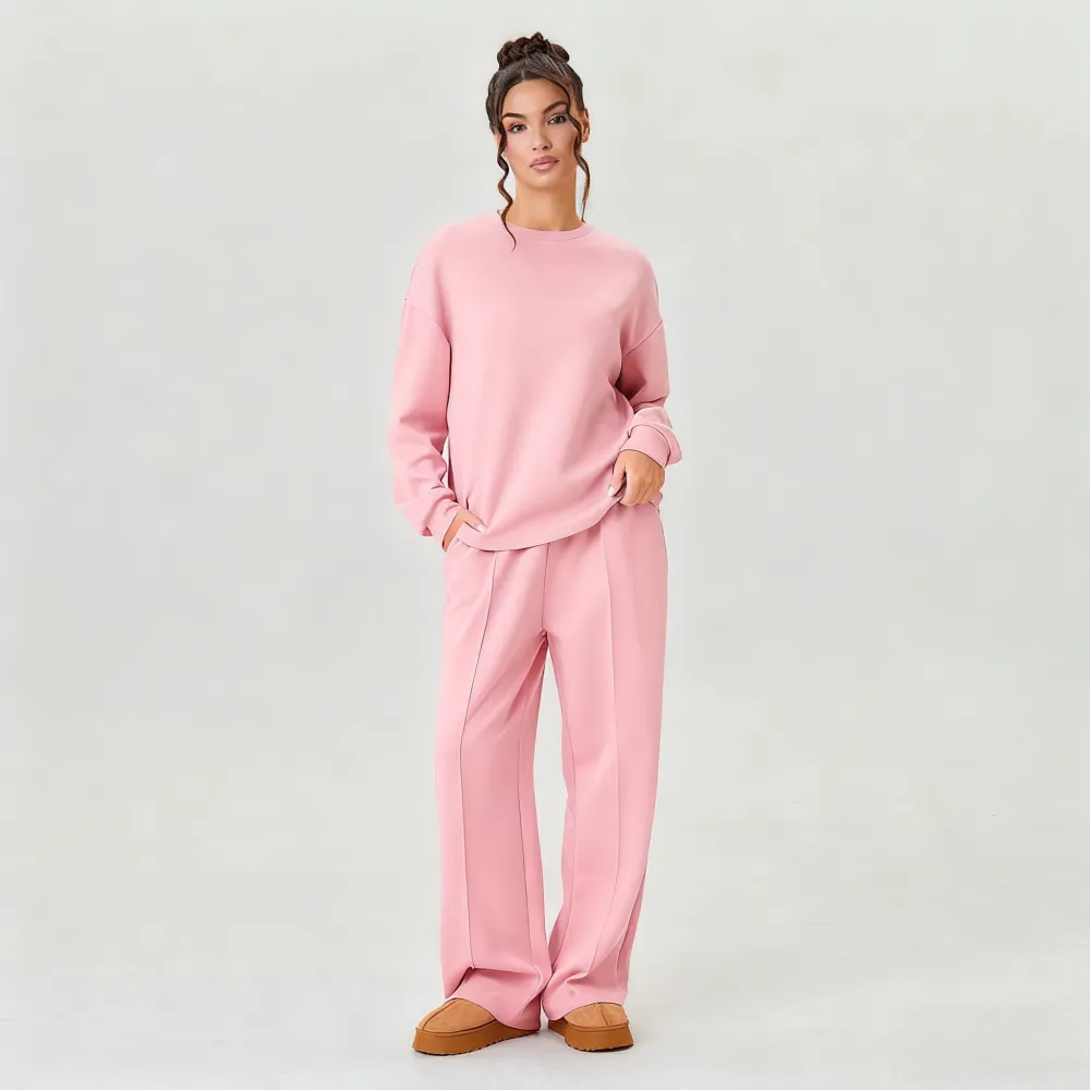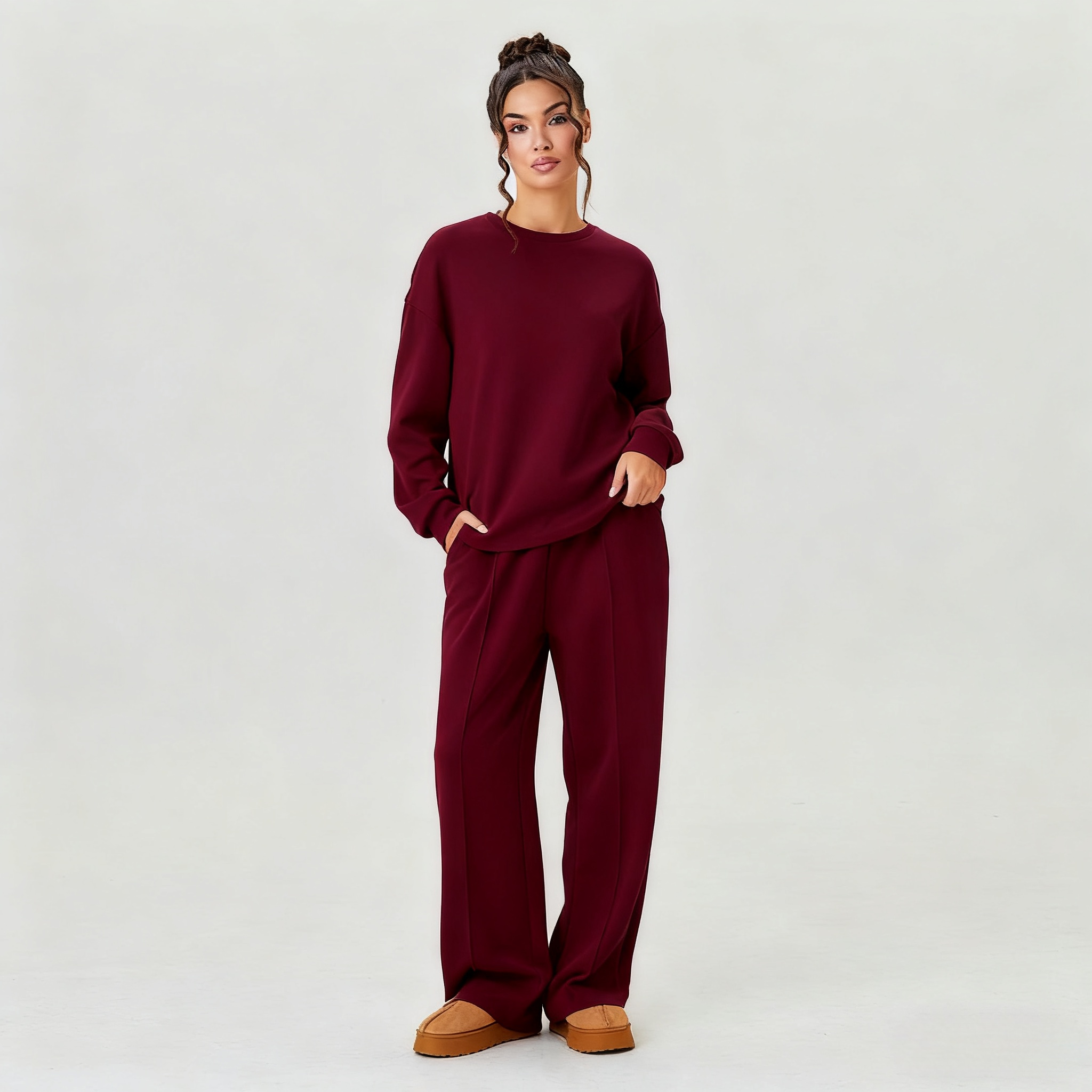 Women's Casual Solid Color Loose Long Sleeve Top & Exposed Stitches Trousers Co-ord