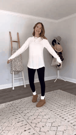 • This is a great shirt if you are looking to wear with leggings. It is comfortable and I’ve actually bought it in a couple colors. It’s one of my staple pieces while being a stay at home mom! It covers the bum and front. And the fabric is great- very soft.