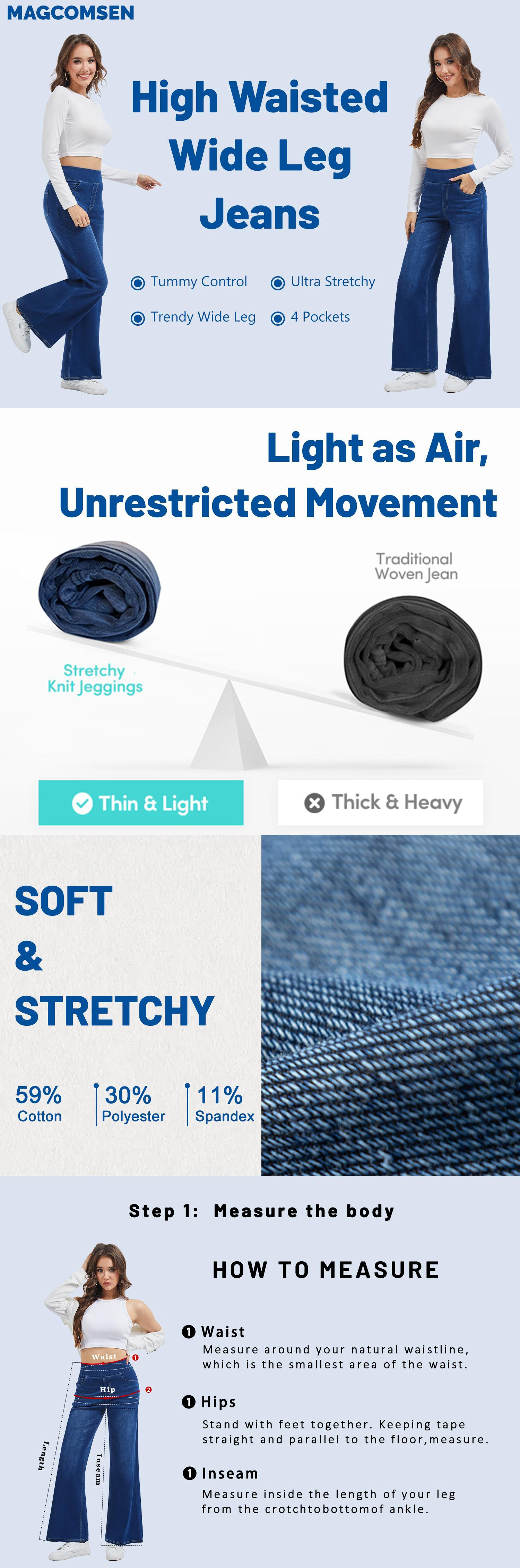 1. [Authentic Denim Look]:Our Wide Leg Jeans are made of 59% cotton, 30% polyester, and 11% spandex. The fabric looks very similar to real denim but feels as comfortable as your favorite pair of pants.
